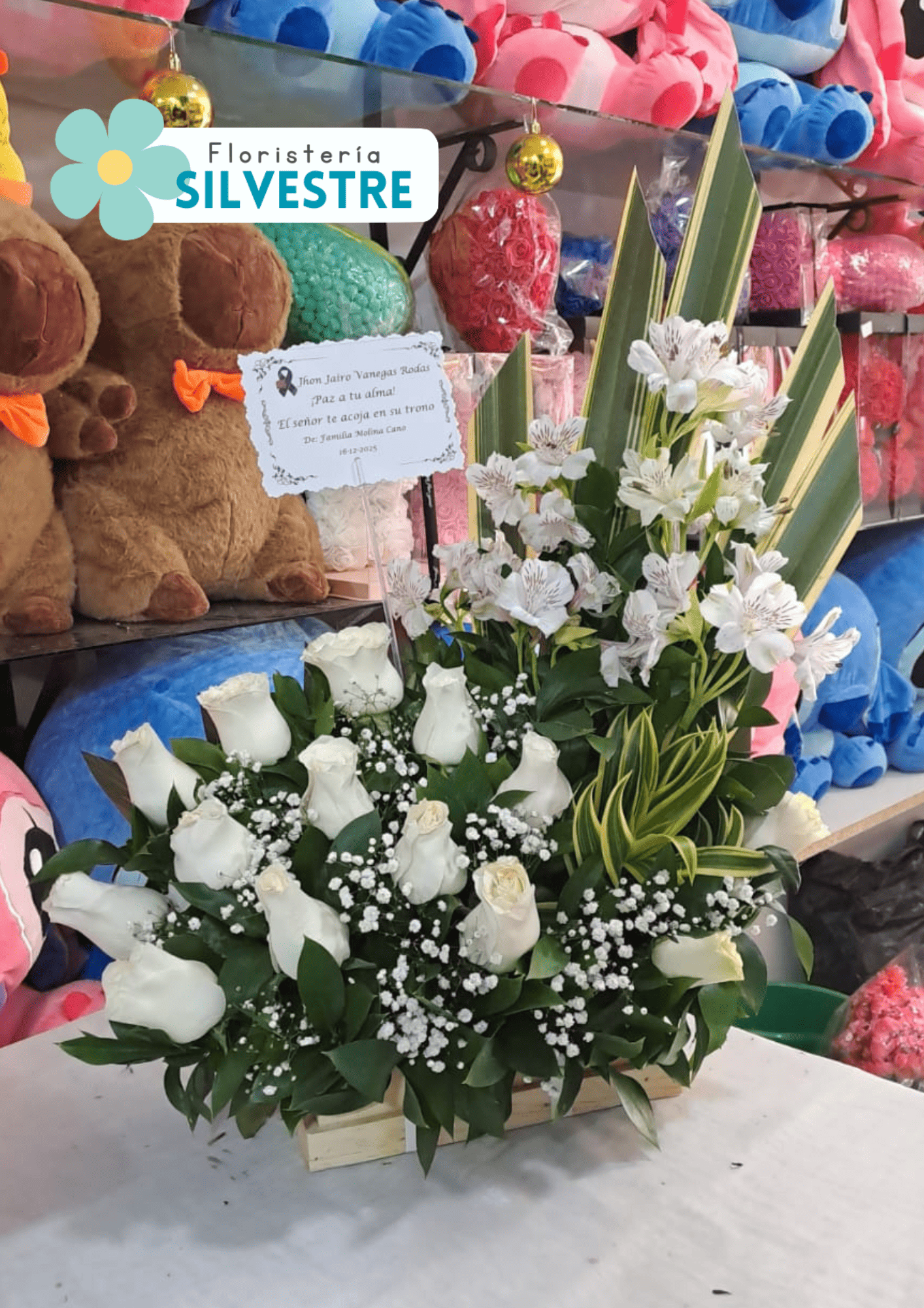Para enviar tus condolencias no hay nada mejor que los arreglos florales, expresa tu sentido pésame a los familiares enviando este hermoso diseño que contiene, rosas blancas, lirios y follajes verdes. Enviando este diseño creará un ambiente de tranquilidad en el seno del hogar que las reciba.