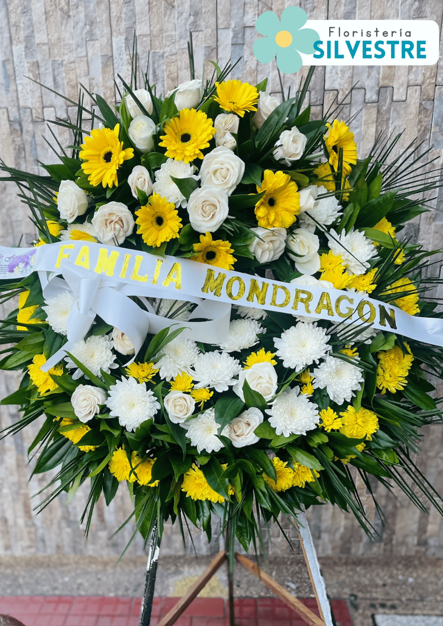 La mejor forma de acompañar y rodear a la familia de la persona fallecida es enviando un arreglo floral, puedes expresar tu sentido pésame de la mejor manera enviando esta elegante corona fúnebre sobre un trípode de bambú, la cual se encuentra elaborada con rosas amarillas, fuyi o crisantemos blancos y follajes verdes.